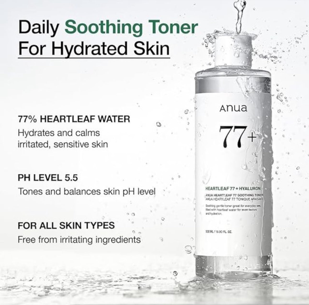 The Anua Heartleaf 77% Soothing Toner is a highly moisturizing and mildly acidic pH toner that’s infused with 77% houttuynia cordata extract along with eleven other food-grade ingredients to soothe skin troubles, regulate skin’s oil-moisture levels and protect skin. The superstar ingredient of this product is Houttuynia Cordata Extract which is known for its moisturizing, anti-bacterial properties, and most notably, its anti-inflammatory. This is greatly effective for calming skin troubles.